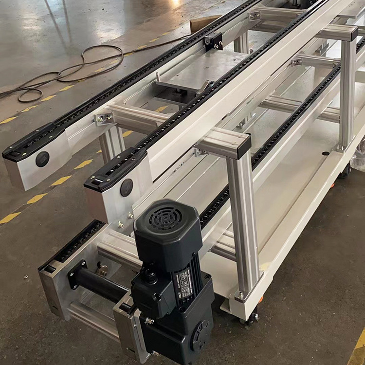 3、铝型材机身:边框为有标准槽口的高强度铝合金型材,方便将输送机安装在其他设备上或在输送机上安装其它附件(如传感器、支架等)